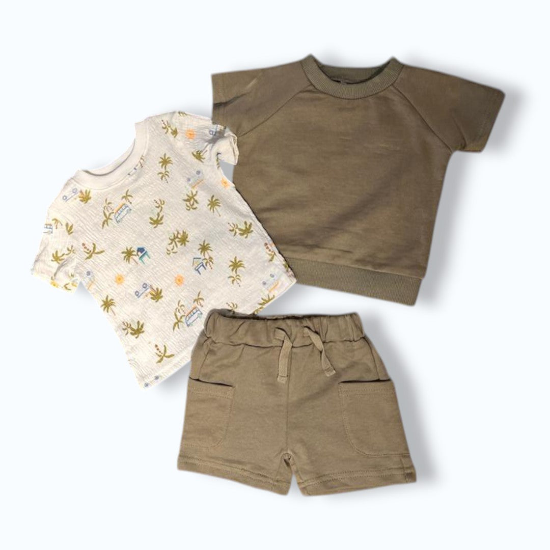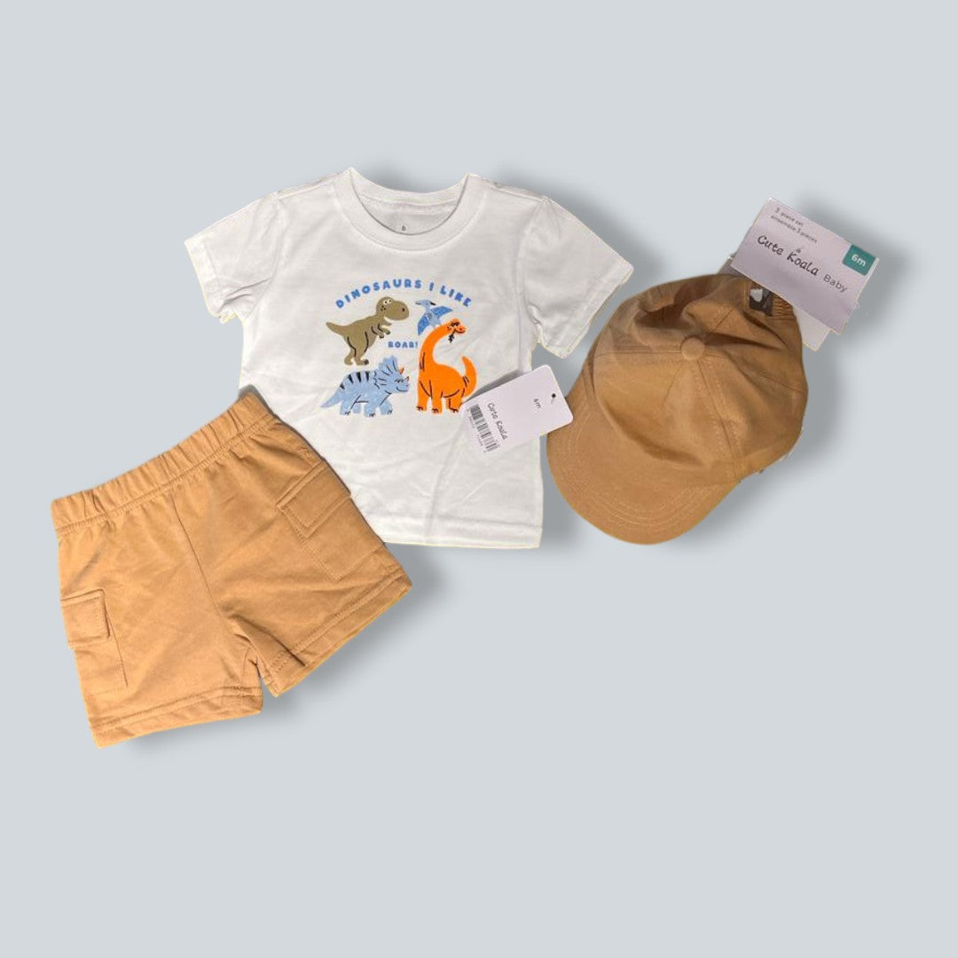 Conjuntos Bebé - Niño MODERNO Y PRÁCTICO PARA PEQUEÑOS AVENTUREROS 🧢 Set de 3 piezas ideal para un look completo sin complicaciones. La camiseta tiene un diseño divertido, el short es cómodo para jugar libremente y la gorra complementa el outfit dándole un estilo único. CARACTERISTICAS: Tela sua...