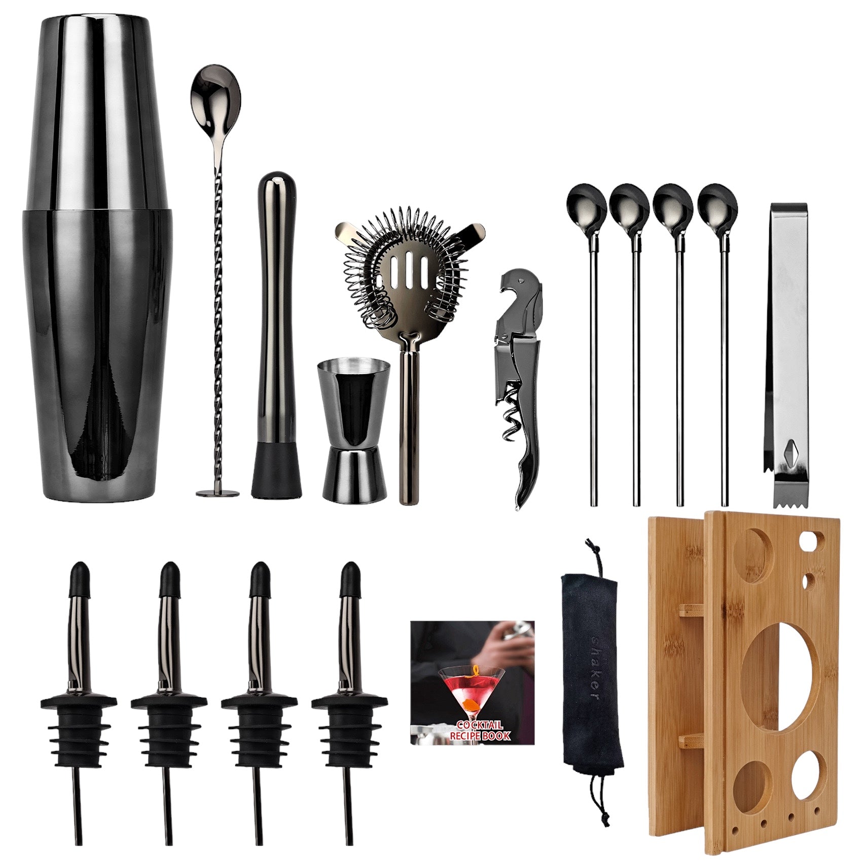 El Kit Coctelería Bar Profesional Cocktail Boston Es el complemento perfecto para los amantes de la mixología. Con 24 piezas, incluyendo sacacorchos, pinza para hielo, jigger, cuchara mezcladora, mortero, coctelera, colador y soporte, tendrás todo lo necesario para preparar tus cócteles favorito...